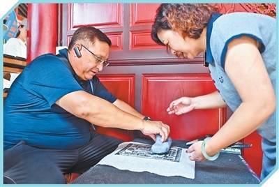 近日,外媒记者(左)在云南省腾冲市和顺古镇体验拓印。 人民网记者 翁奇羽摄